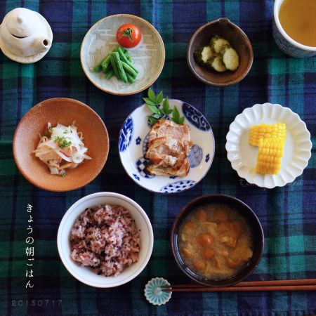 きょうの朝ごはん 古代米と鶏ももの塩麹焼き