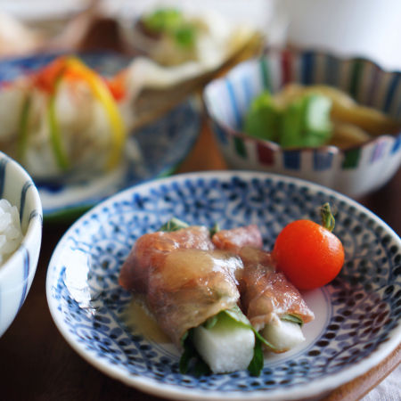 山芋は大葉を巻いて生ハム巻いてドレッシングで・・