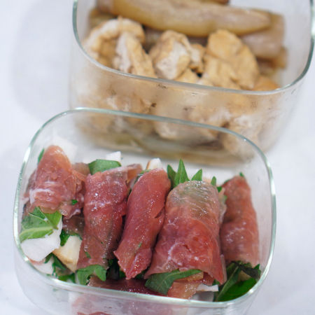 山芋スティックに大葉を巻いて生ハムを巻く。