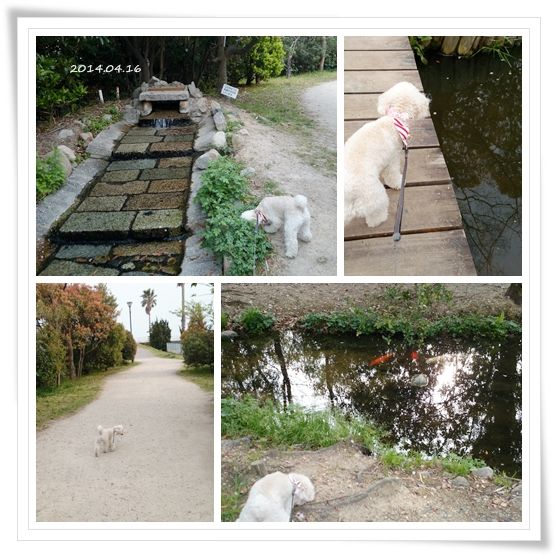 池で泳ぐ鯉や魚にcomomoも興味津々・・・